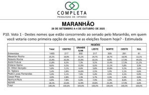Uma nova pesquisa do Instituto completa Completa, realizada entre os dias 28 de setembro e 4 de outubro de 2025, revelou o impacto político que uma possível aliança entre o prefeito de São Luís, Eduardo Braide, e o ex-prefeito de Santa Rita, Dr. Hilton Gonçalo, pode ter na corrida pelo Senado Federal em 2026.
