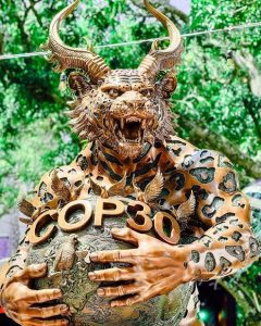 A exibição de uma estátua de aparência híbrida e simbologia forte durante atividades paralelas da COP30 gerou intensa repercussão nas redes sociais. A obra, que mostra uma criatura com chifres, múltiplos olhos e um globo nas mãos, foi interpretada por parte do público como um símbolo “satânico” e até como mensagem silenciosa sobre poder e controle global. Especialistas em arte e comunicação visual, porém, afirmam que se trata de uma peça conceitual criada para provocar reflexão sobre a crise climática e o impacto humano no planeta, destacando que elementos impactantes costumam ser utilizados justamente para gerar debate.