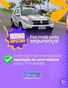 Além da obra, Solange Almeida também confirmou a destinação de emenda parlamentar para a aquisição de uma nova viatura, que irá reforçar a estrutura operacional do batalhão. De acordo com a deputada, a entrega do veículo está prevista para ocorrer em breve, contribuindo para mais agilidade e eficiência no serviço policial.